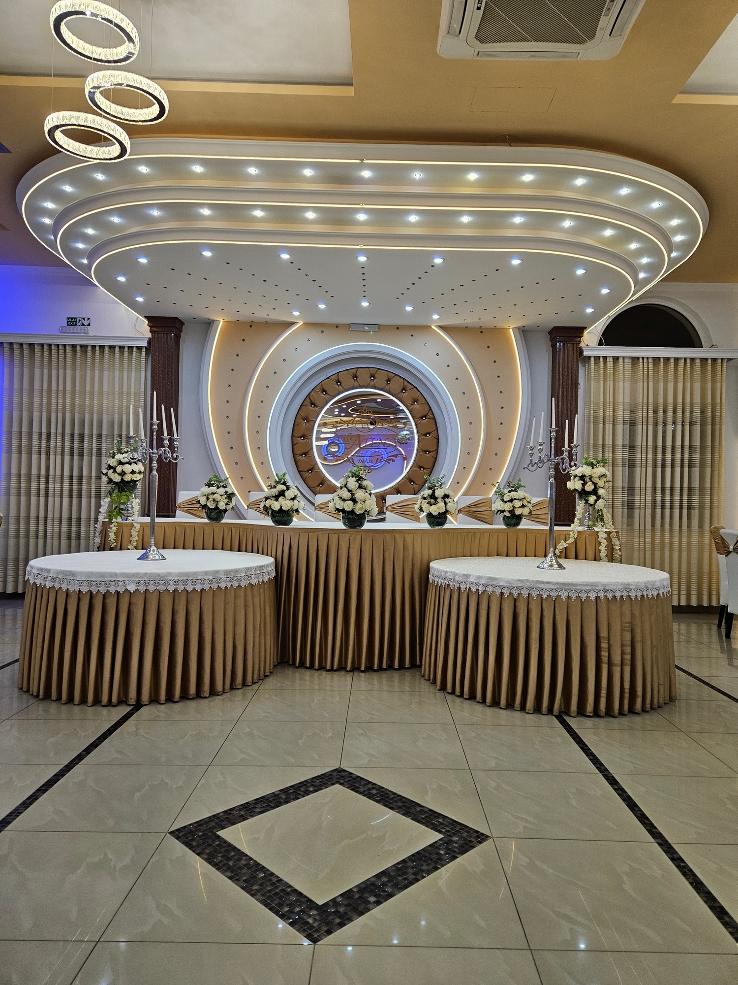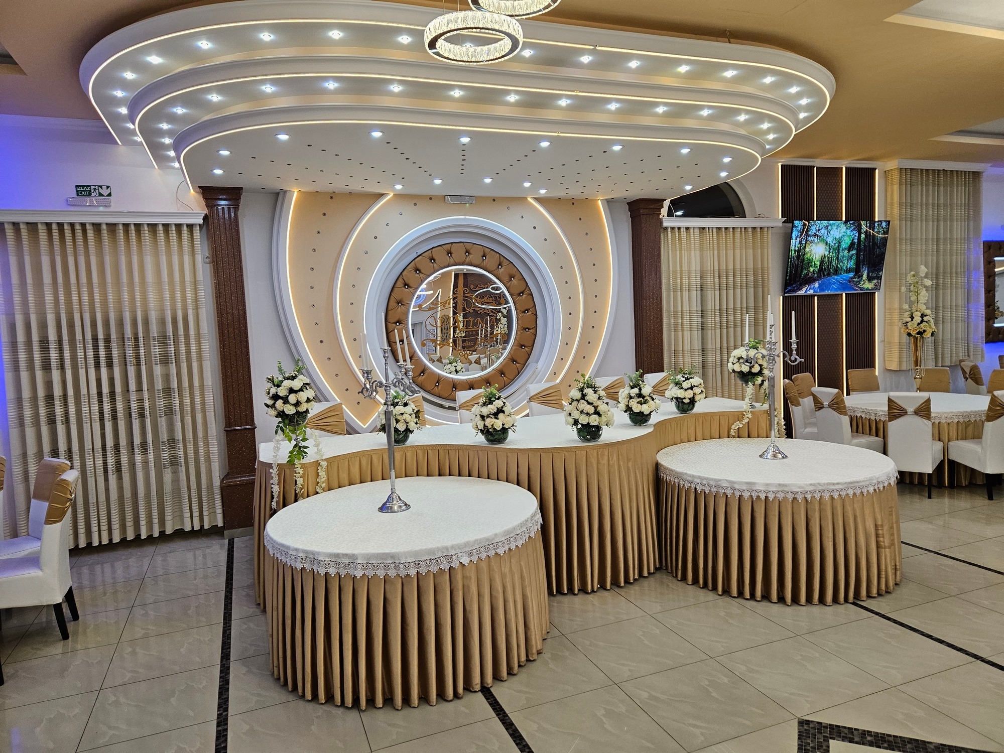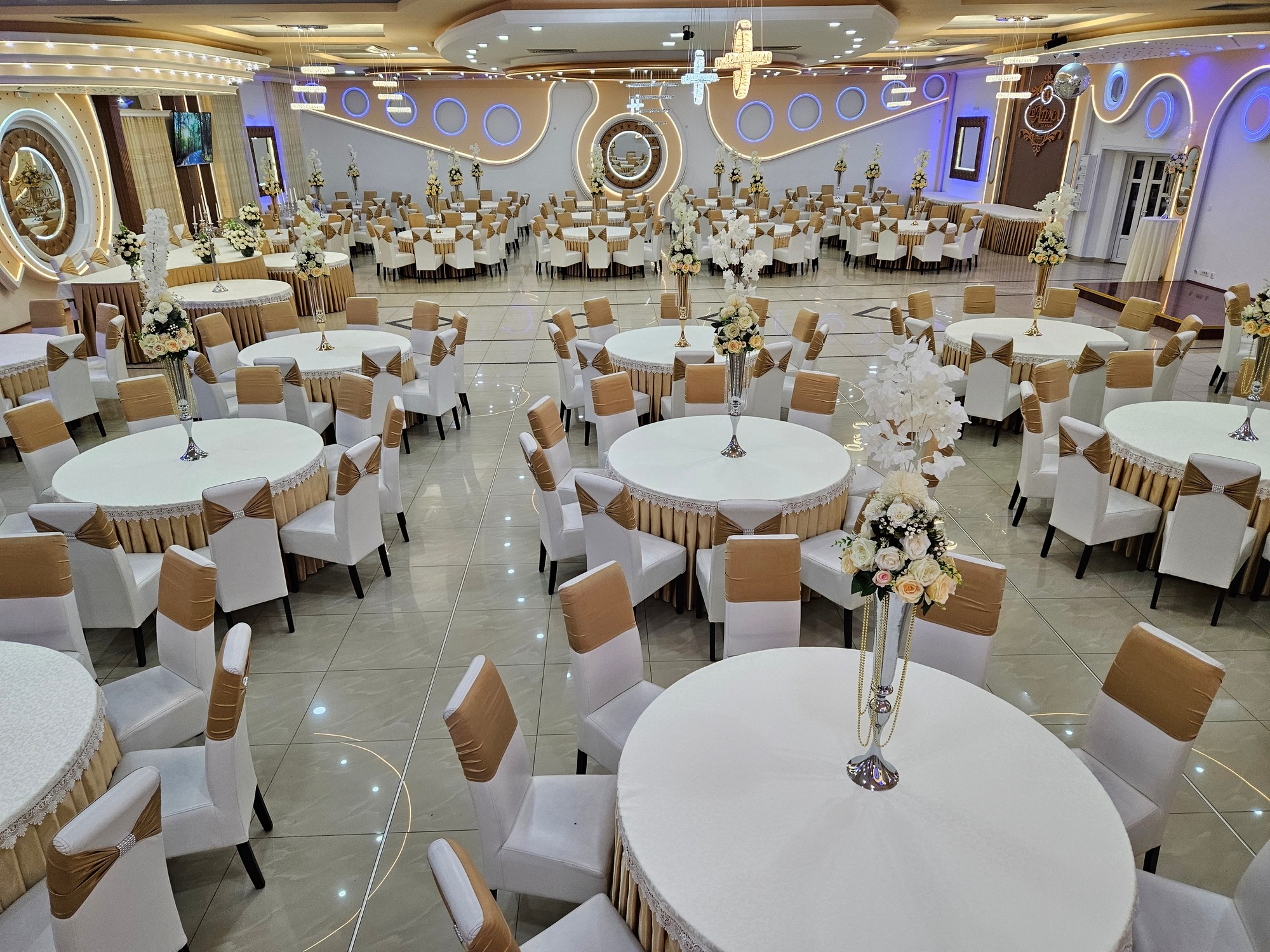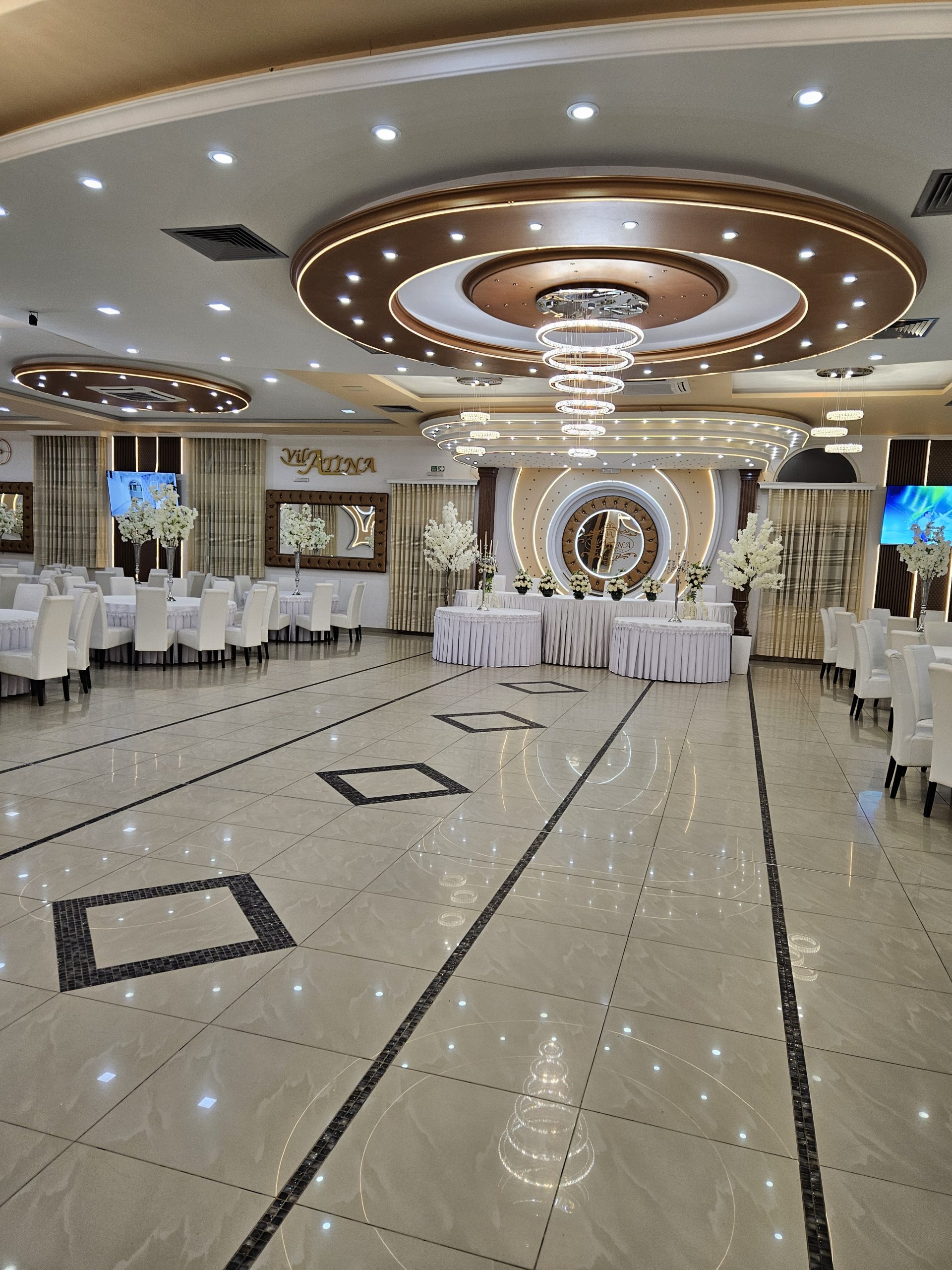 Enterijer Grand sale odiše elegancijom – kombinacija modernog osvetljenja, pažljivo biranog inventara i neutralnih tonova omogućava da se dekoracija lako prilagodi svakom stilu venčanja. Bilo da želiš klasičnu belu dekoraciju, boho stil, pastelne tonove ili efektnu kombinaciju boja, sala je savršena baza za svaku vrstu tematske svadbe.