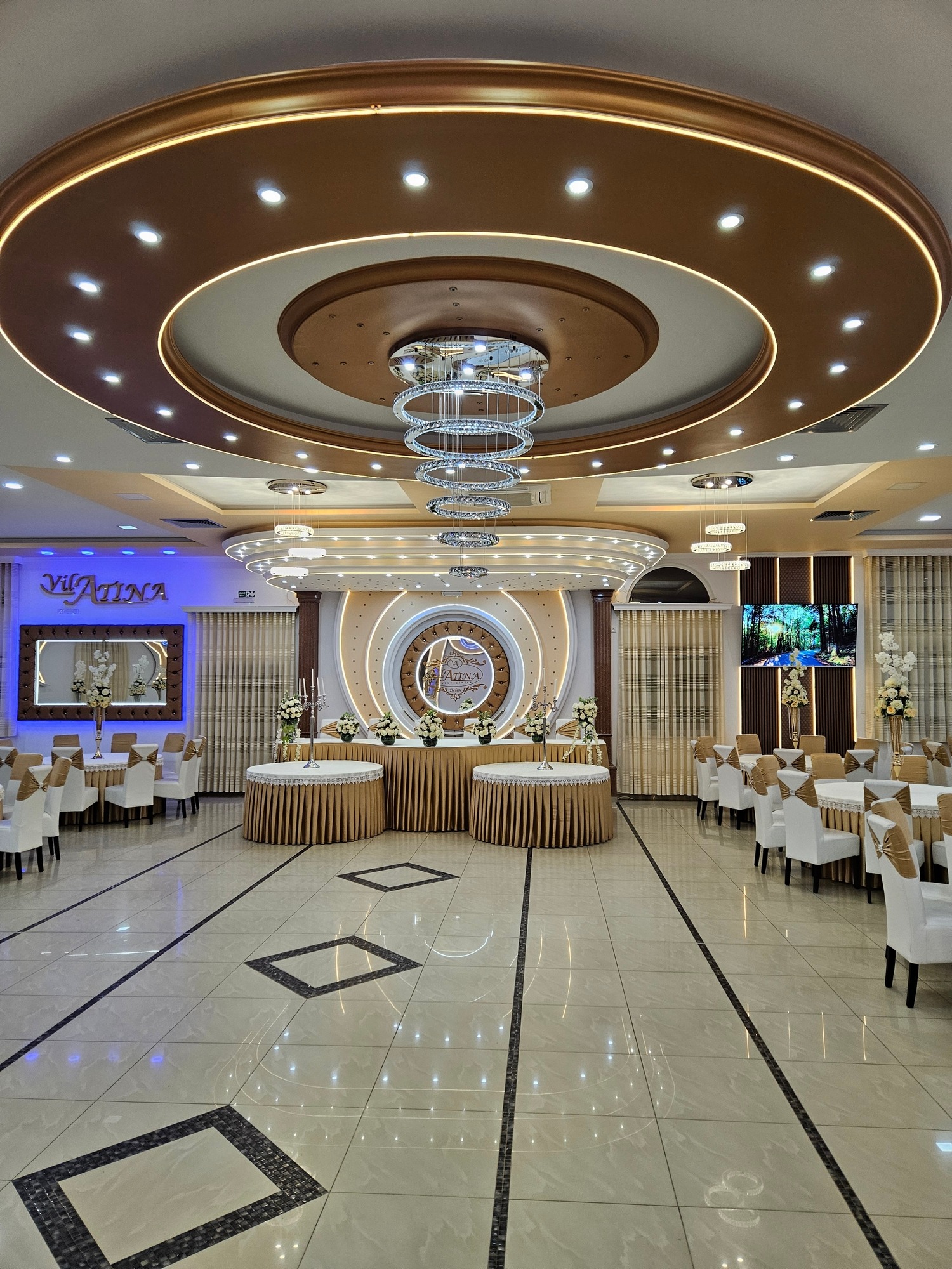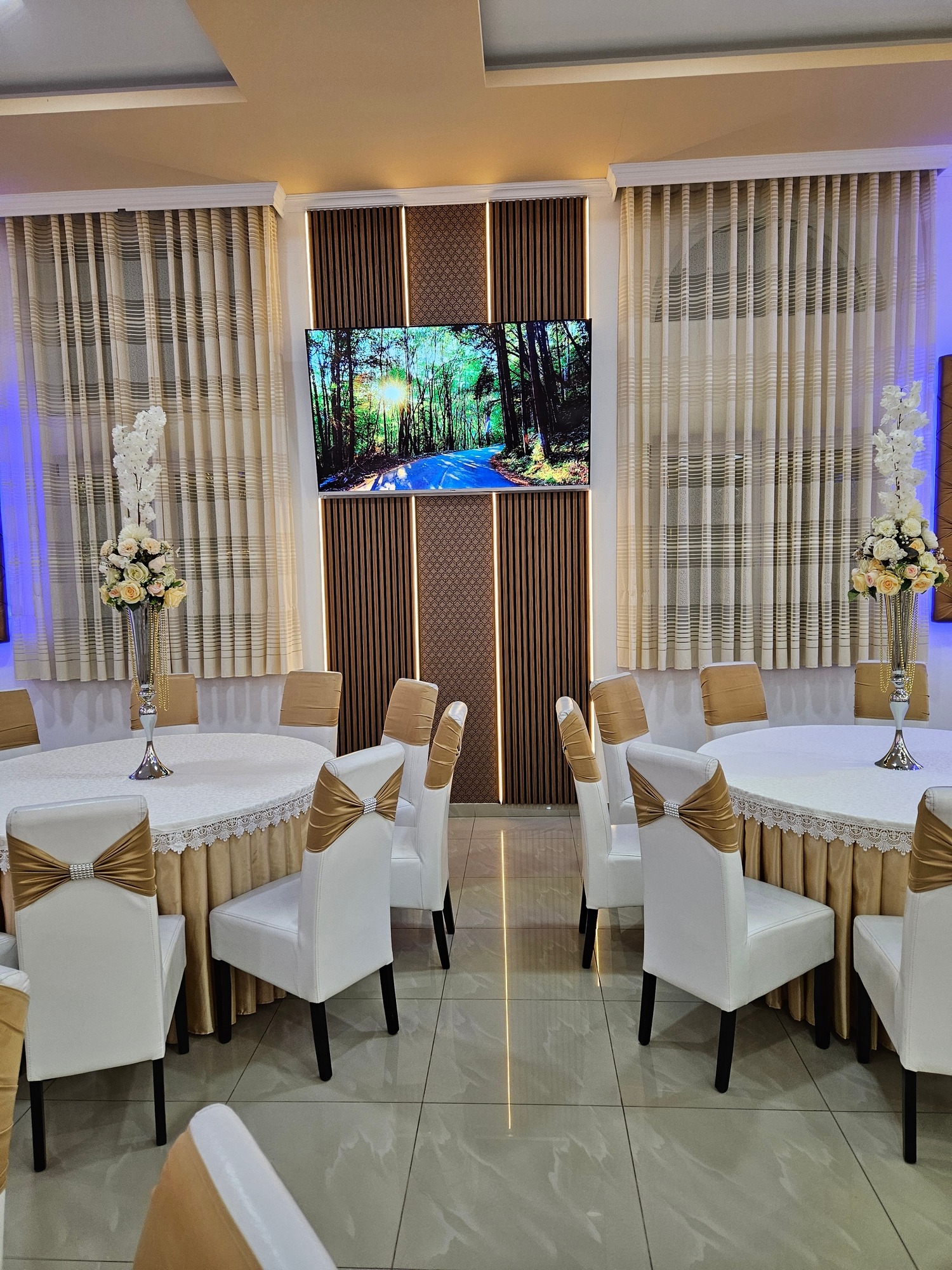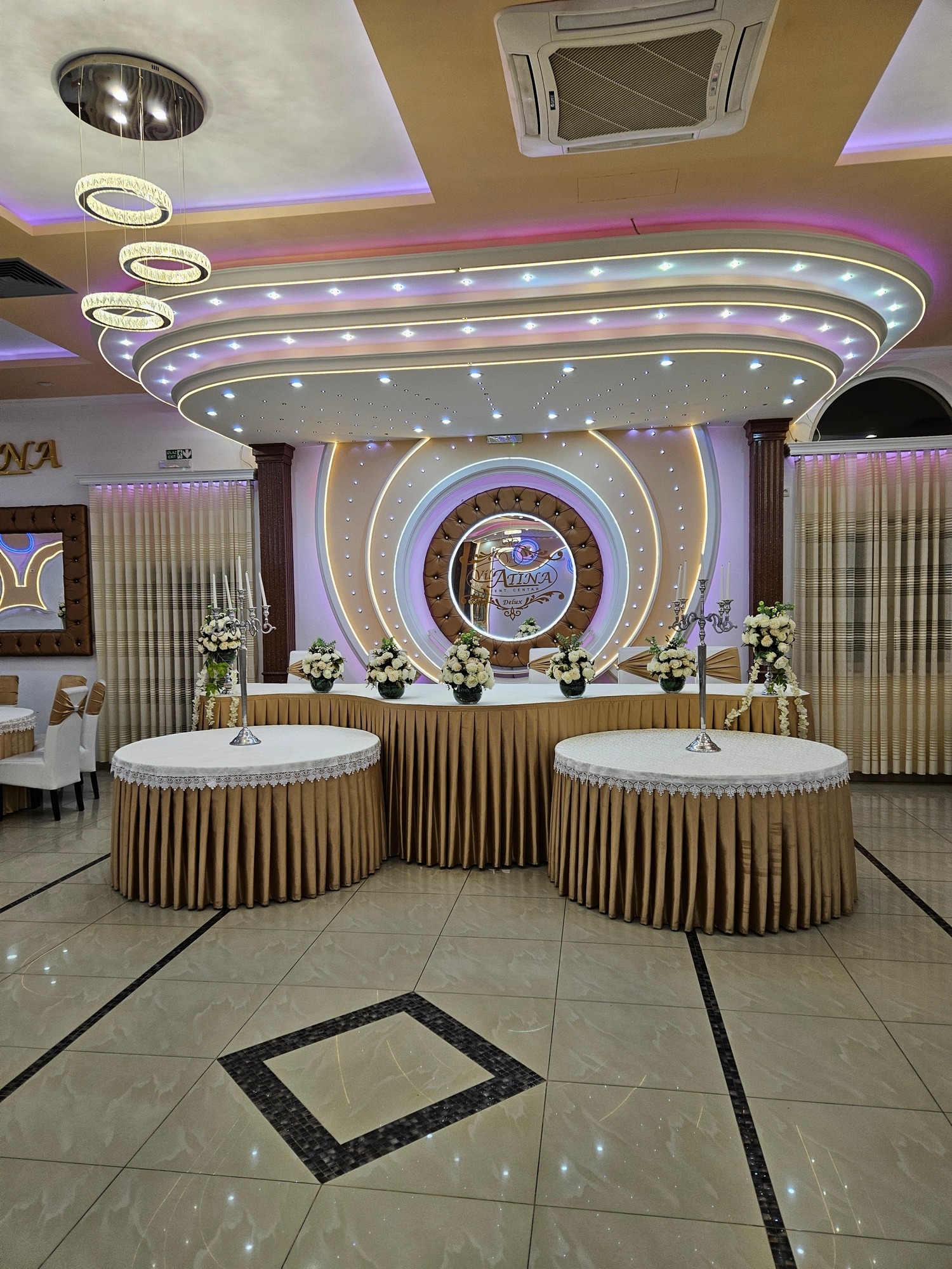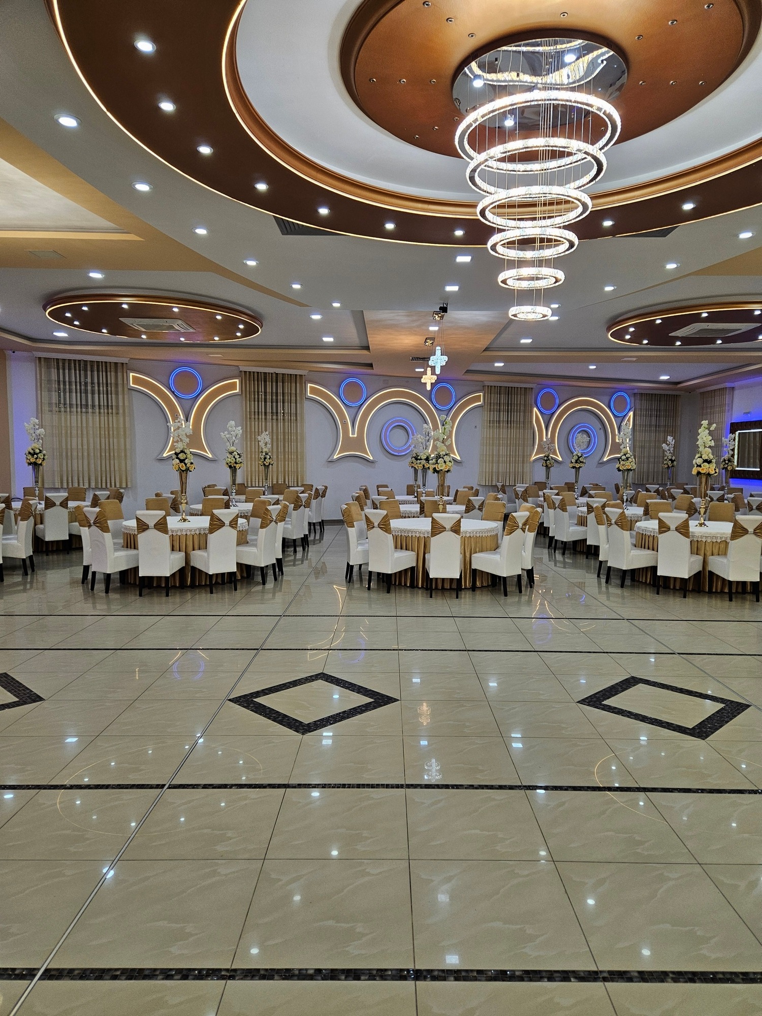 Enterijer Grand sale odiše elegancijom – kombinacija modernog osvetljenja, pažljivo biranog inventara i neutralnih tonova omogućava da se dekoracija lako prilagodi svakom stilu venčanja. Bilo da želiš klasičnu belu dekoraciju, boho stil, pastelne tonove ili efektnu kombinaciju boja, sala je savršena baza za svaku vrstu tematske svadbe.