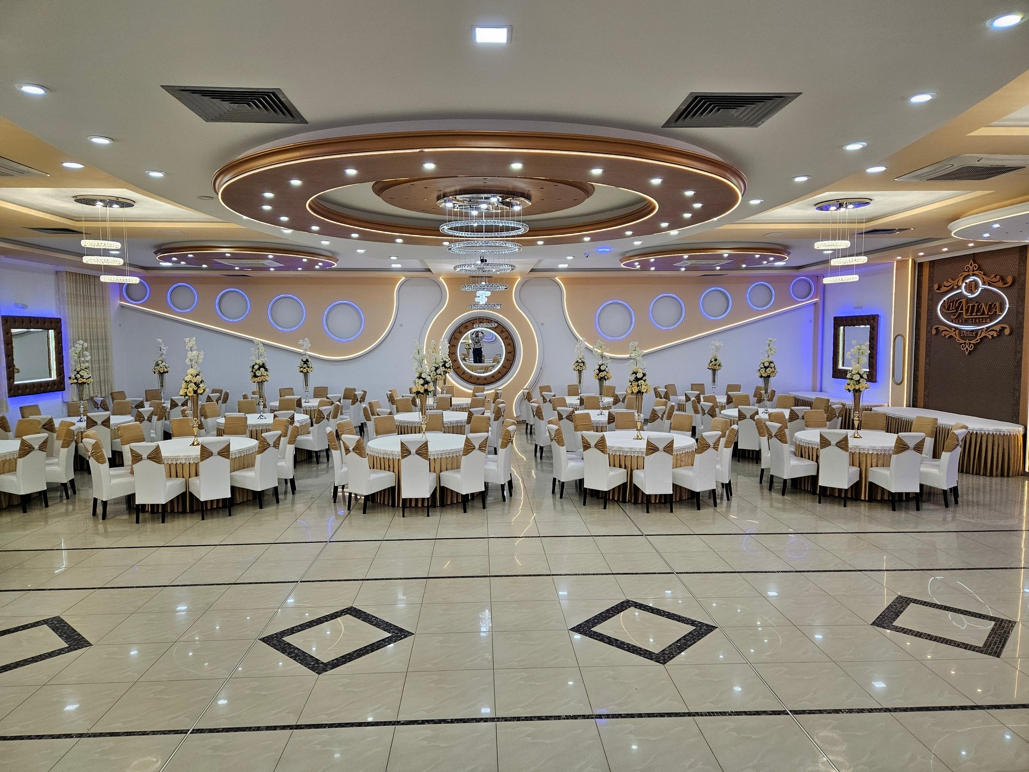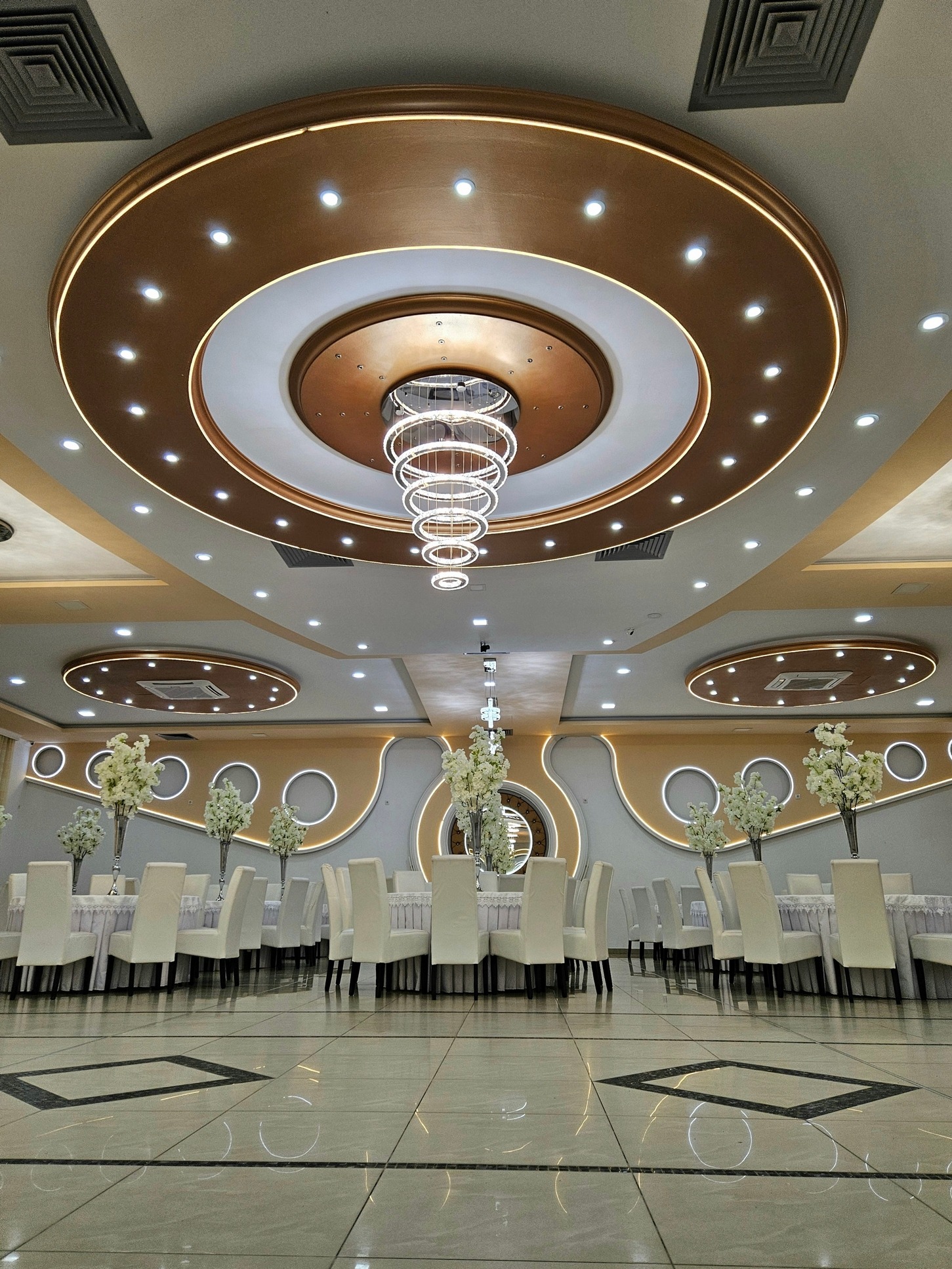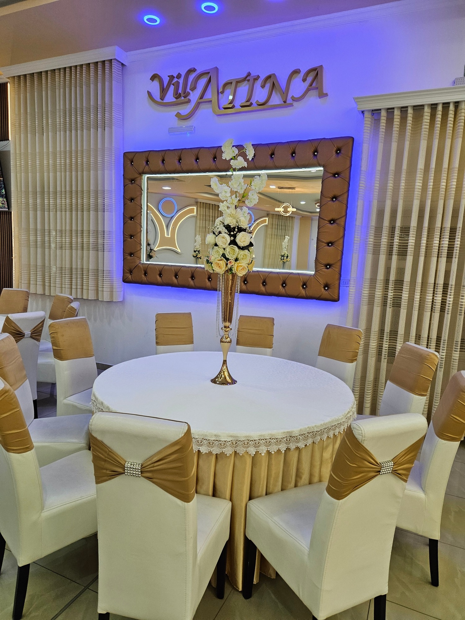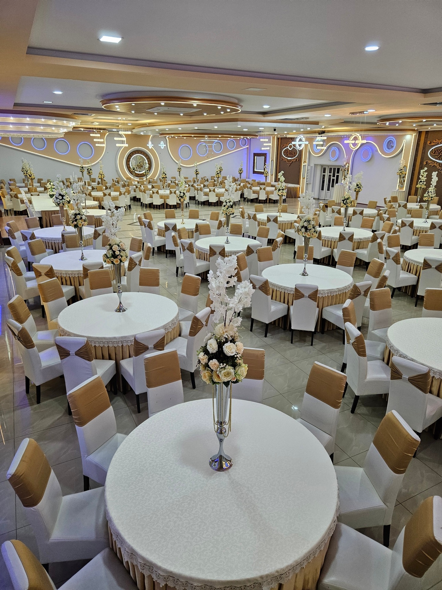 Enterijer Grand sale odiše elegancijom – kombinacija modernog osvetljenja, pažljivo biranog inventara i neutralnih tonova omogućava da se dekoracija lako prilagodi svakom stilu venčanja. Bilo da želiš klasičnu belu dekoraciju, boho stil, pastelne tonove ili efektnu kombinaciju boja, sala je savršena baza za svaku vrstu tematske svadbe.